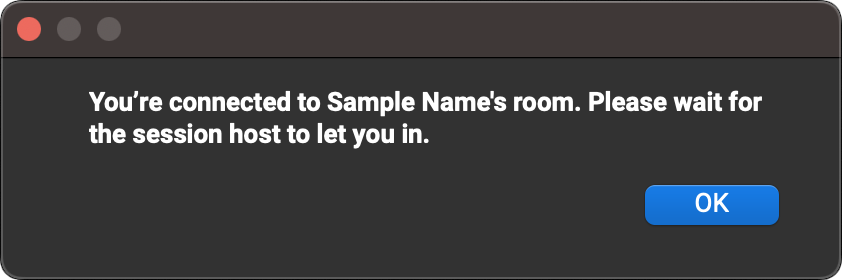 When a participant arrives, they are shown a dialog box that tells them they’ve connected to your room and to wait for the session host to let them in.
