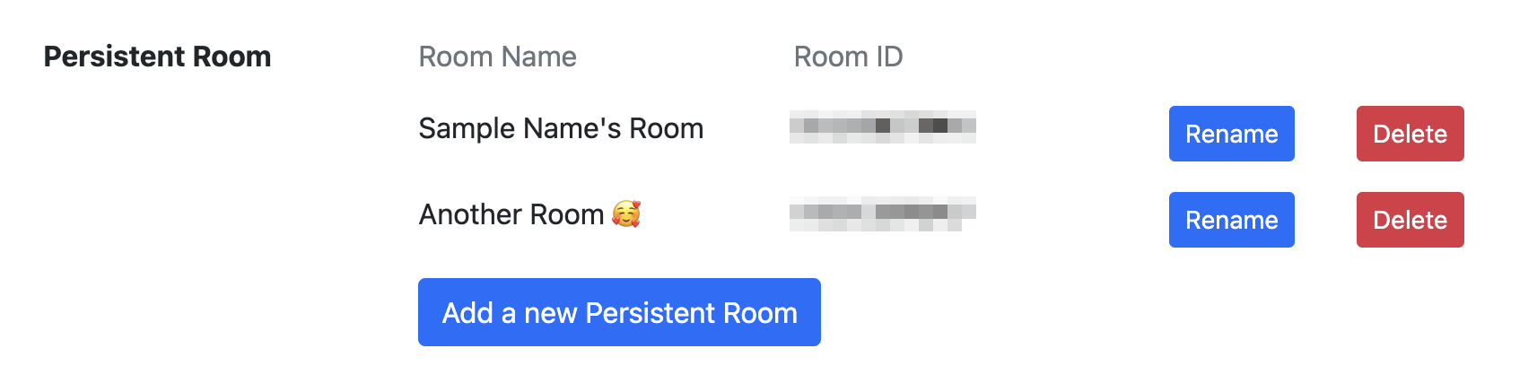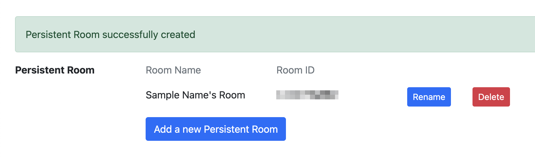 - To change the name of the room, click Rename. If, for whatever reason, you no longer want to use a particular Persistent Room ID, click its Delete button. You can create a new Persistent Room in its place.