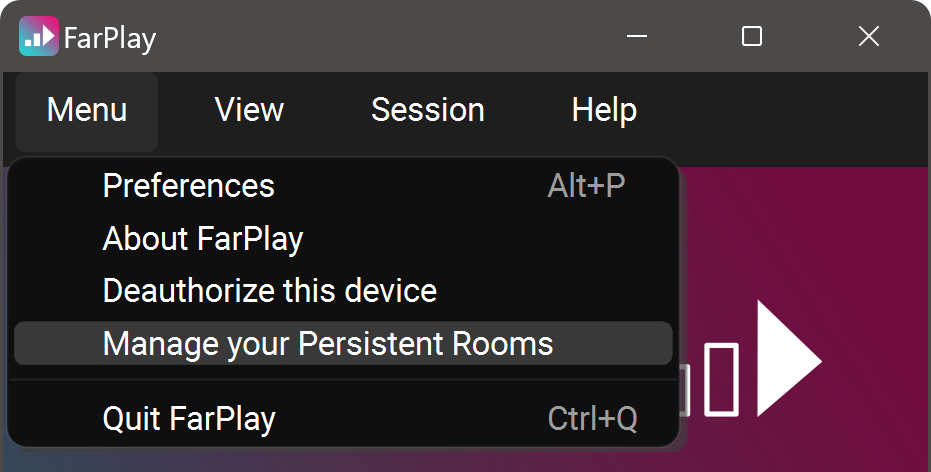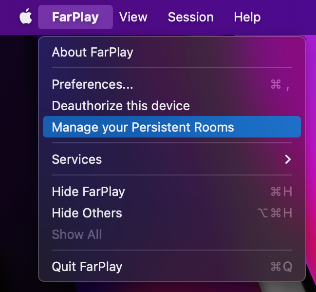 - You can rename, delete, and create Persistent Rooms. To do so, click the FarPlay Menu and choose Manage your Persistent Rooms.