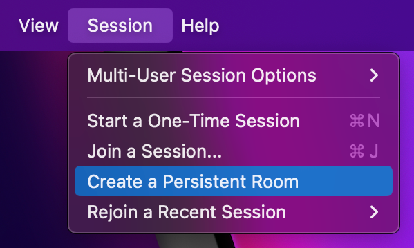 Alternatively, click the Session menu and choose Create a Persistent Room there.
