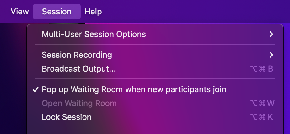 Session menu to change whether the Waiting Room pops up automatically each time a participant arrives.