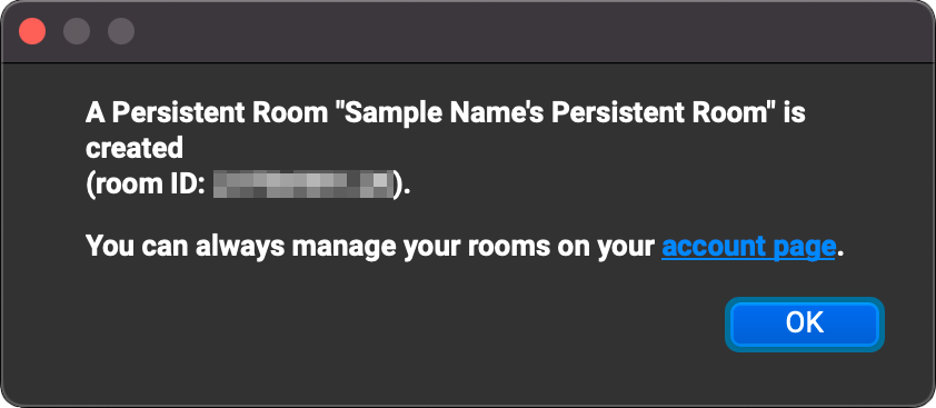 - After the confirmation message for the creation of your Persistent Room appears, press OK to go to your new Persistent Room.