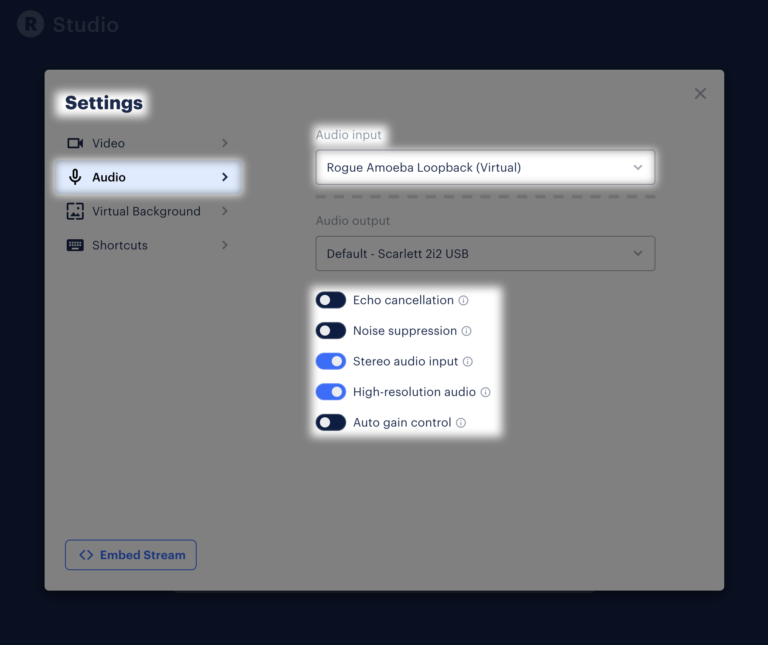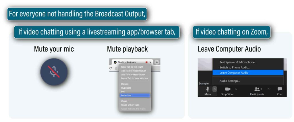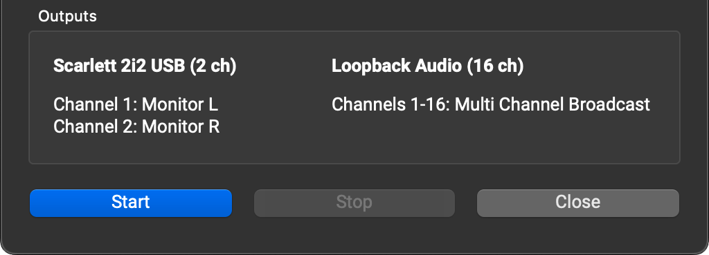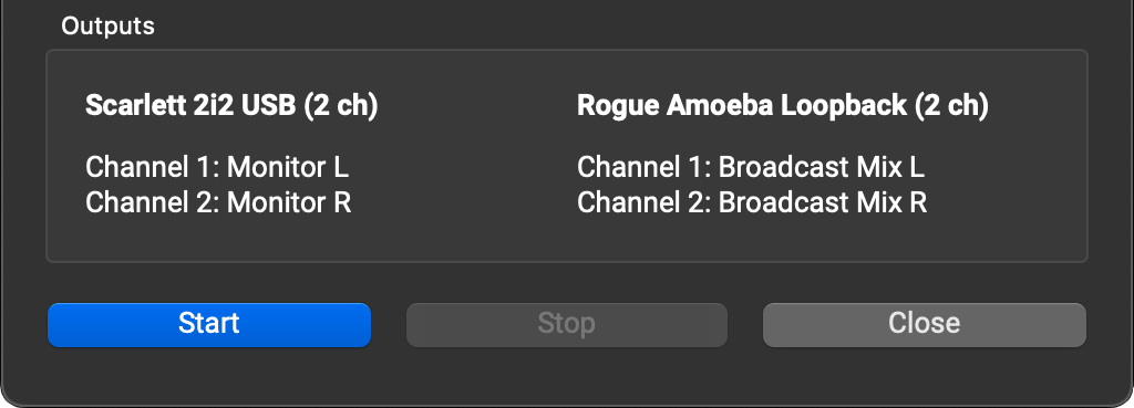 You can send FarPlay session audio via Broadcast Output to a virtual sound card and then onward to a DAW (examples: Logic Pro and Reaper). This is useful for recording in the DAW, where you can adjust levels and add effects, like reverb. You can also send a stereo mix out from your DAW to another virtual sound card and onward to a livestreaming application.