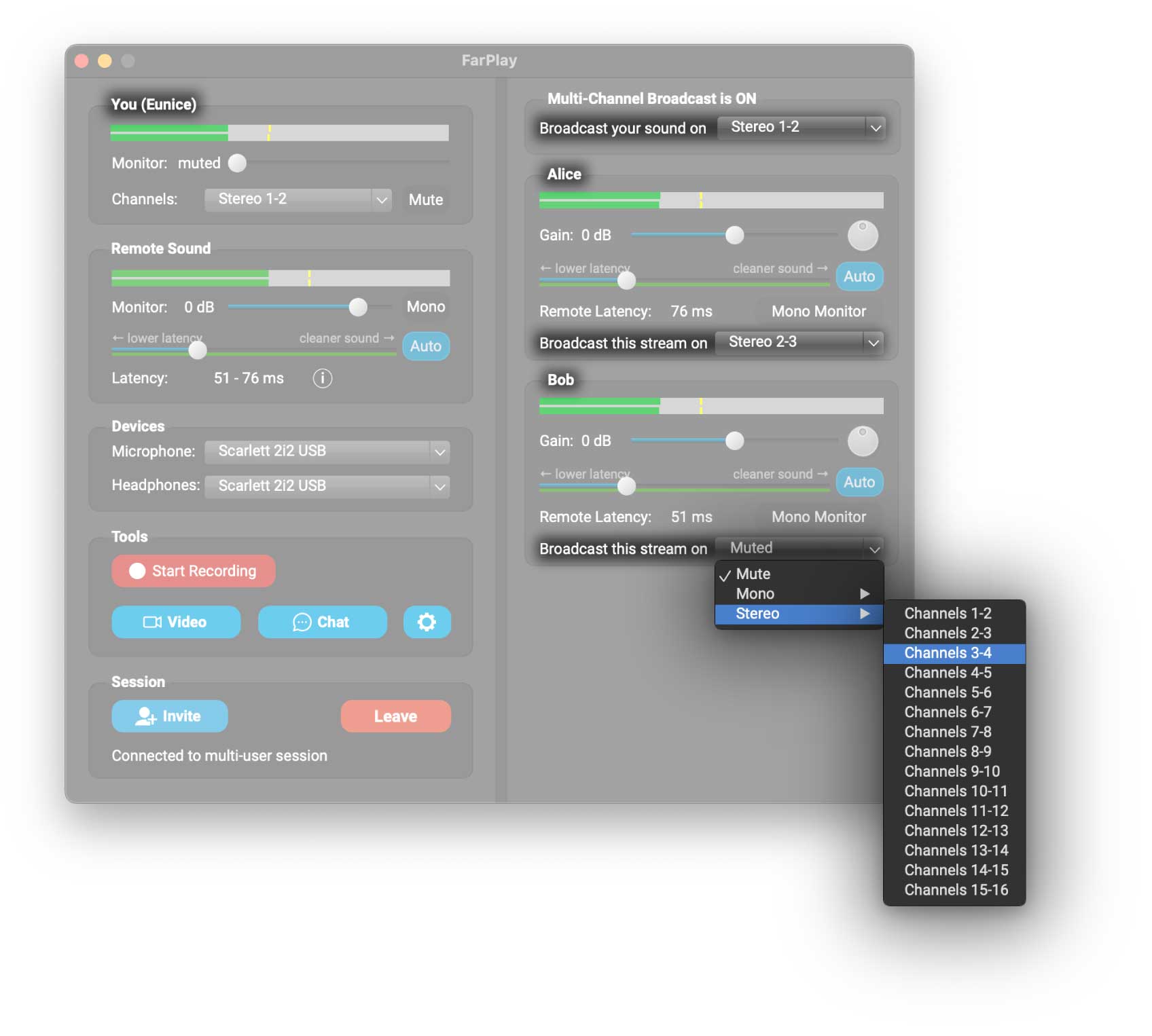 FarPlay’s latency slider lets you tune the balance between lowness of latency and cleanness of sound. You might tolerate some static (audio drop outs) to keep latency low so you can keep the beat when you’re making music. You might also want to share a higher-latency, cleaner mix of your session with a live audience. How does FarPlay let you do both at the same time?