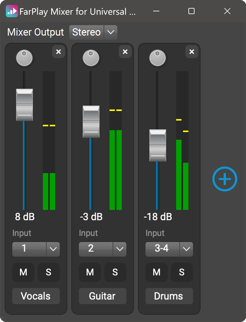 In the mixer, click the circled plus to create a new track. Set its Input to channel 2. Click the circled plus to create another track. Set this new track’s Input to channel 3. Keep adding tracks in the FarPlay mixer until you have one track for each channel on your Tascam.
