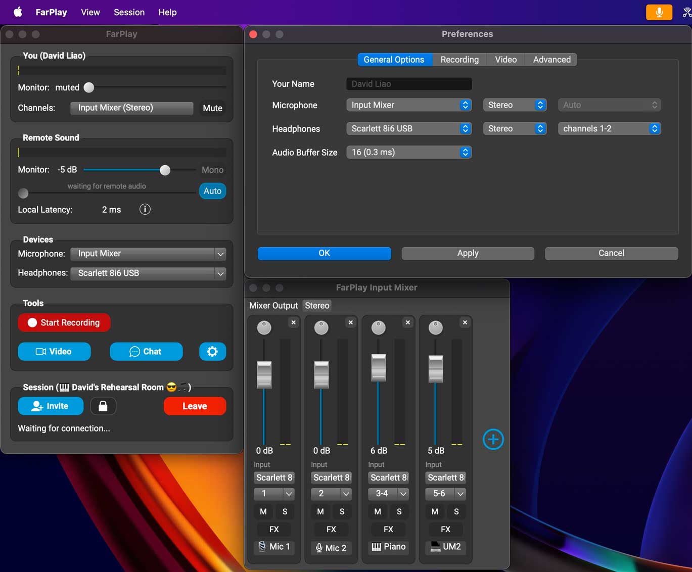 If you could share screenshots showing FarPlay’s main window, Preferences > General Options, and Input Mixer (if used) on your computer and your partner’s computer, I’d be happy to take a look and give customized suggestions.