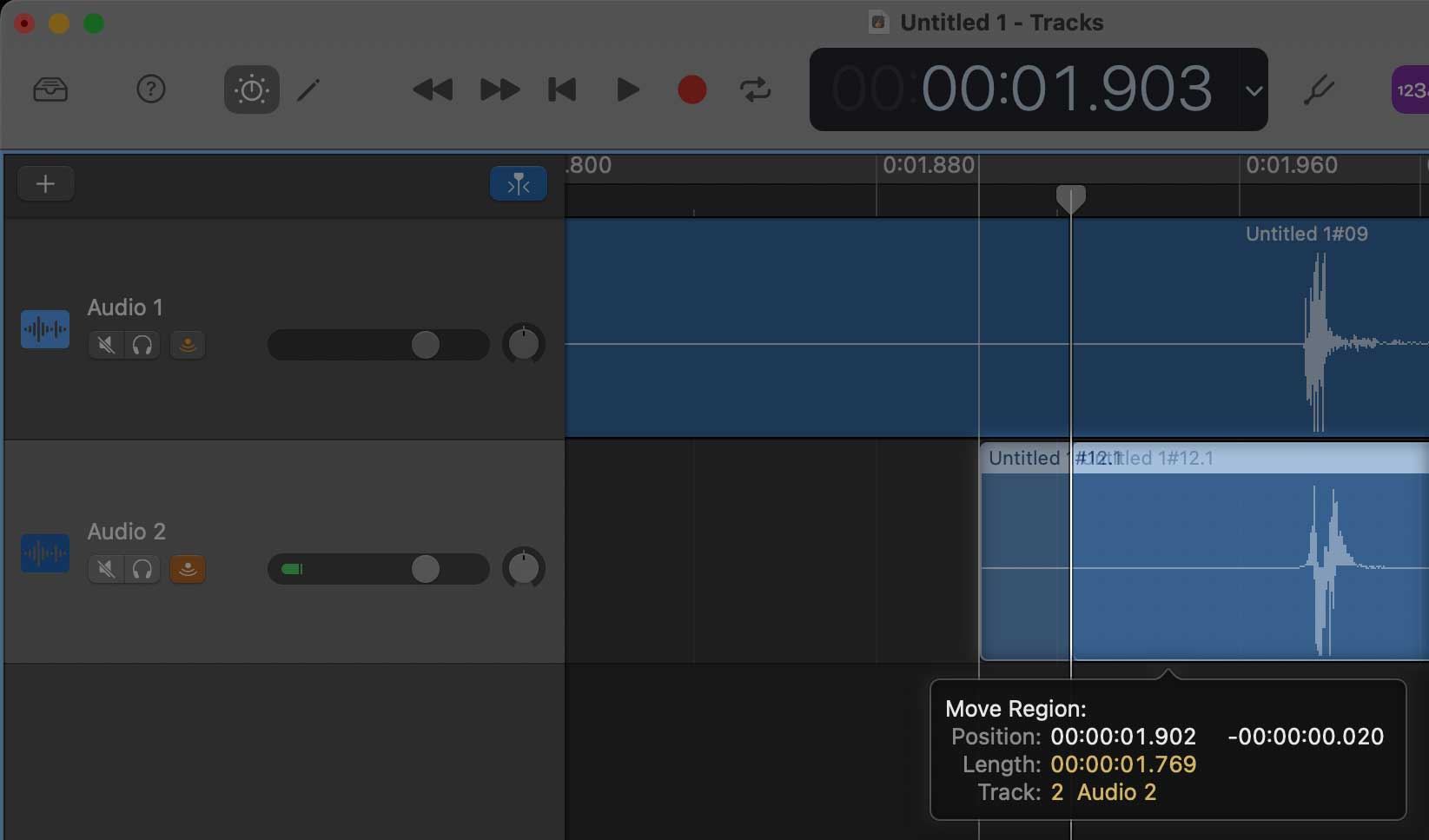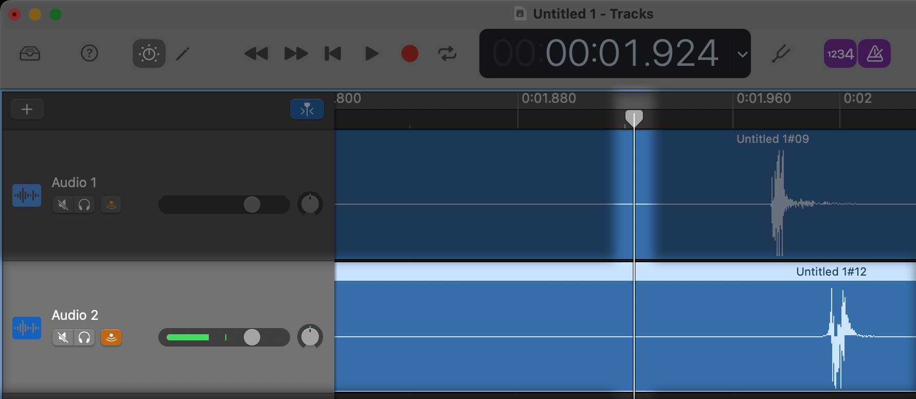 Drag the remaining portion of Audio 2’s track a small amount to the left. Play the recordings to check whether the tracks are in sync. If not, drag the track for Audio 2 again.