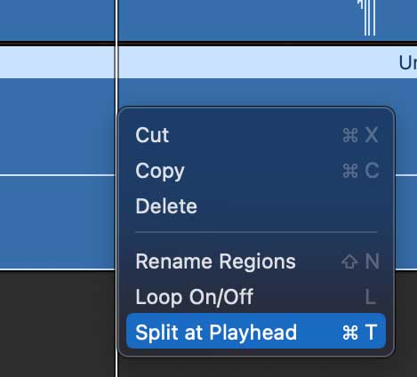 In this example, the track labeled “Audio 2” belongs to the especially distant player. Select Audio 2. Split this track at the playhead (in Garage Band, Control-Click on the track, then choose “Split at Playhead”).