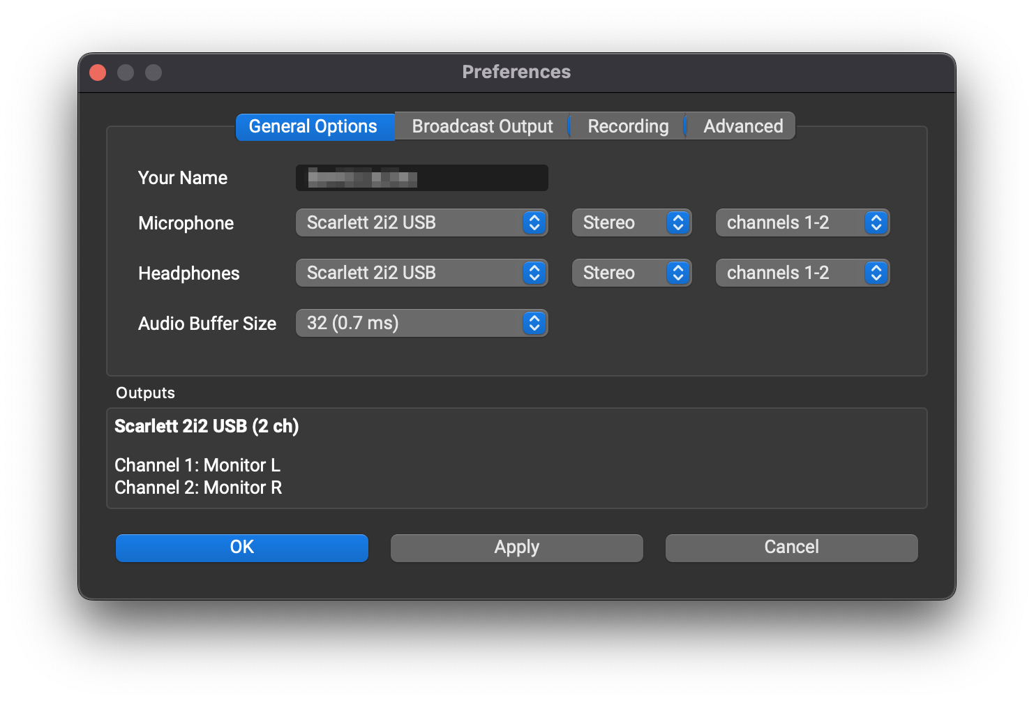 . In the General Options tab, use the Headphones pull-down menu to choose your audio interface, then use the next two pull-down menus in the Headphones row to choose Stereo and the two channels of your audio interface you’d like the remote audio channels to be played through.
