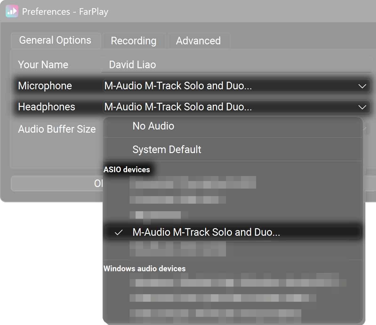 > General Options, check that the Microphone is still set to ASIO devices > M-Audio M-Track Solo and Duo…. Do the same for the Headphones.