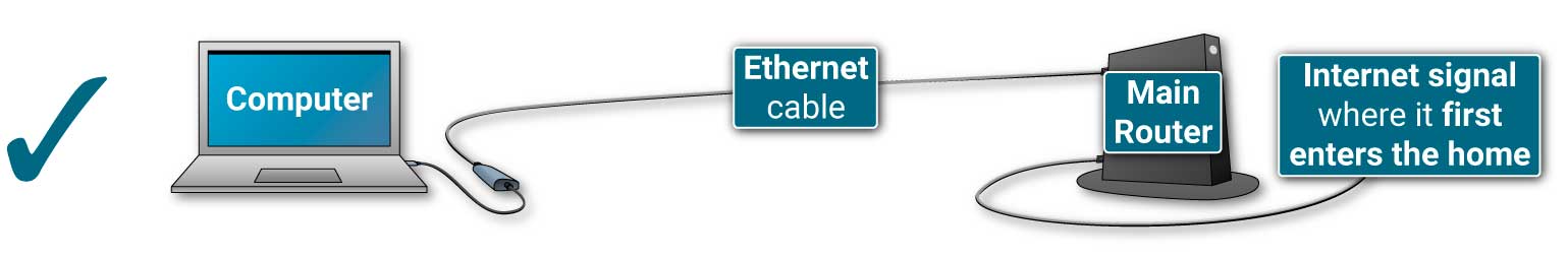 If you have too much latency, try the suggestions in Part 1 first. If latency is still too high, try suggestions from Part 2, etc.- Make sure each participant’s computer is connected directly by Ethernet to the main router. The main router is the router that is directly connected to the outside internet (could be fiber, cable, or satellite internet) — the main router receives the internet signal at the point where it enters your home.