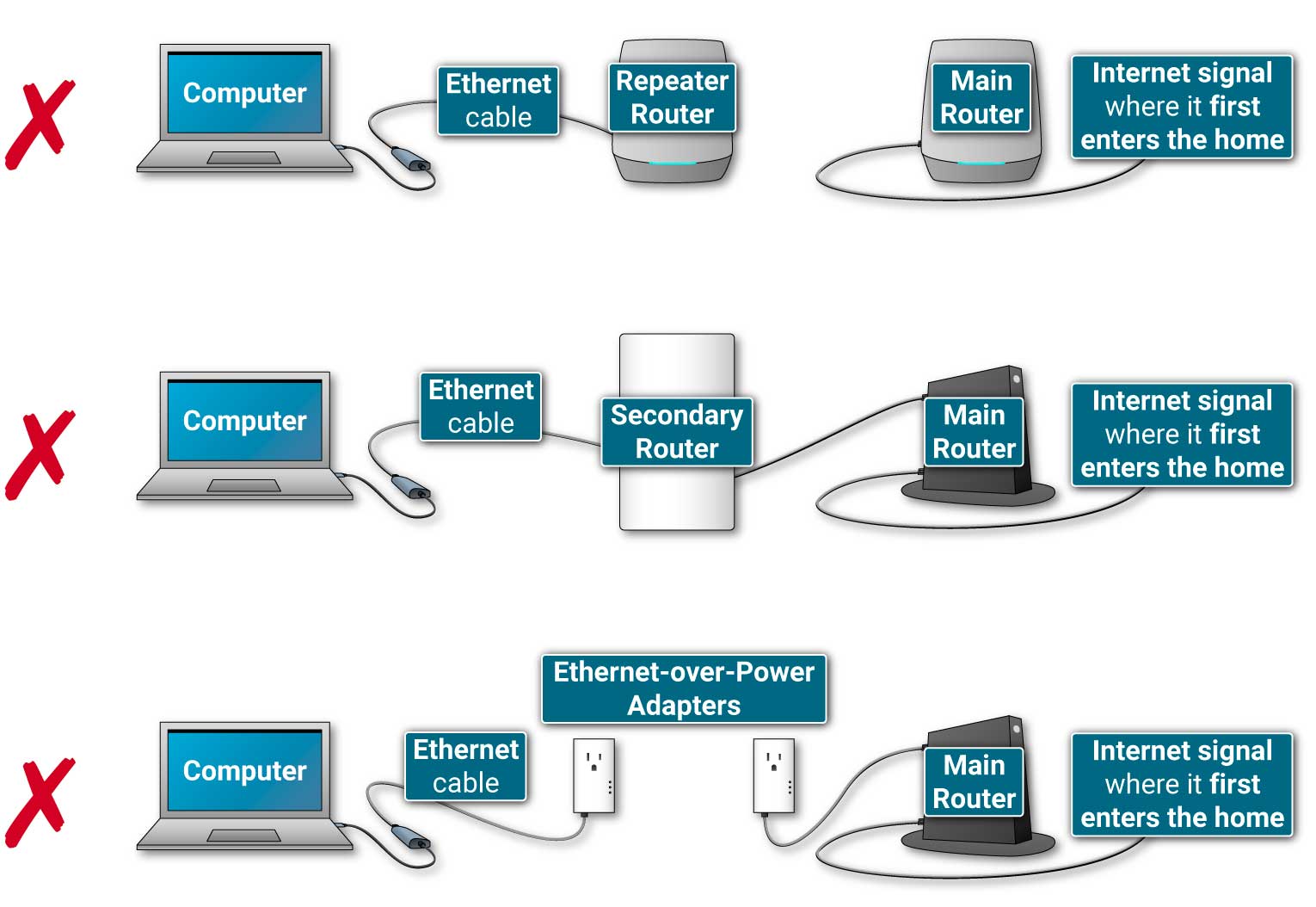 Don’t use a wireless extender/repeater router, secondary router (like an Apple Time Capsule), or Ethernet-over-power adapter (like a Powerline adapter). A repeater/extender router repeats the signal from your main router.